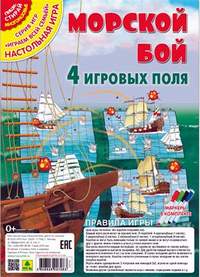 Морской бой на четверых. (4 игровых поля) +4 маркера. Настольная игра из серии "Играем всей семьей". Правила игры: «Потопить» все корабли соперника (ов). Каждый игрок рисует на игровом поле 10 кораблей: 4 однопалубных (1 клетка), 3 двухпалубных (2 клетки), 2 трёхпалубных (3 клетки), 1 четырёхпалубный (4 клетки). Корабли не могут быть ломаными (только по прямой линии) и не могут соприкасаться друг с другом, можно ставить в углы и у стенок игрового поля. Выстрелы наносятся каждым игроком поочерёдно, по одному из противников по своему выбору, называя координаты выстрела (например, А2). Для удобства каждый выстрел отмечается маркером (в комплекте 4 шт.) на поле соперника. В случае попадания даётся возможность повторного выстрела. Корабль считается утопленным в случае попадания во все клетки (палубы) корабля. Играть можно одновременно 2-4 игрокам или командой 2х2, игроки из одной команды не «топят» корабли друг друга. Возможны другие (усложнённые) варианты игры: с минами(Которая рисуется в виде кружочка. Если противник попадет в эту точку, он будет обязан выдать одну из своих не пораженных клеток),минным тральщиком (Рисуется как треугольник в одну клетку. Попав в тральщик, игрок раскрывает сопернику расположение одной из своих не взорванных мин.), подводной лодкой (Она изображается в виде ромба, занимает одну клетку и может соприкасаться с кораблями, но не помещаться под ними. Перед тем, как затонуть, делает выстрел в такую же клетку противника) О количестве дополнений игроки договариваются заранее. Материалы: картон, пластмасса. Не рекомендуется детям до 3-х лет. Содержит мелкие детали. Упаковано в пакет с подвесом.