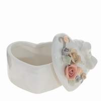 Перед вами изящная фарфоровая шкатулка в форме сердца, которая станет настоящим украшением любого интерьера. Главным декоративным элементом служит композиция из фарфоровых цветов: аккуратные розы и листья выполнены в нежных пастельных тонах — розовом, персиковом, бежевом и зеленоватом. Кроме того, крышку украшает миниатюрный бантик, добавляющий шкатулке нотку романтики и изысканности. Эта шкатулка идеально подойдет для хранения украшений, памятных мелочей или станет прекрасным подарком для близкого человека.