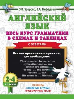 "Весь курс грамматики в схемах и таблицах" написана известными педагогами-практиками О. В. Узоровой и Е. А. Нефёдовой. Пособие соответствует ФГОС и программе обучения английскому языку в начальной школе и даёт возможность ученикам быстро проверить свои знания по грамматике английского языка. Учителя и родители могут отметить время, которое ребёнок затратил на выполнение заданий. На каждой странице дано контрольное время. Пособие можно использовать в качестве дополнительного материала на уроках в классе, а также для работы дома. Для начального образования.