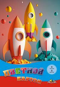 Цветной картон, А4, 8 л., 8 цв., в папке, "Ракеты"